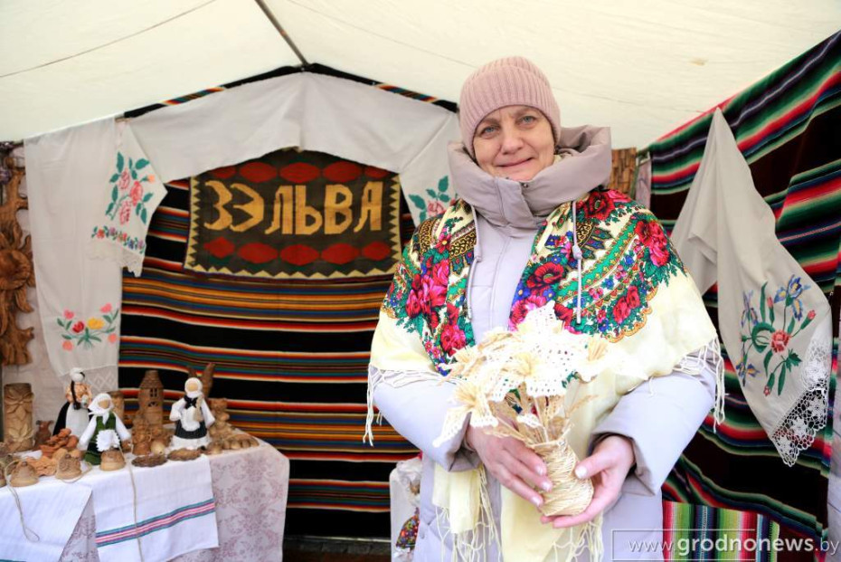– Мы показываем рушники, которые вышивала Нина Петровна Шурак. Это двухсторонняя гладь: с одной и другой стороны вышивка одинаковая. Также представили одеяло, которому уже 50 лет. Еще у нас представлены пэчворк (лоскутное шитье) от мастера Инны Аникевич и сувенирная продукция из соломки от Ольги Юшкевич, – рассказала  заведующая отделом ремесел Ольга Крако. – Всегда очень приятно присоединяться к этому празднику. Здесь много разных ремесленников, разнообразные вещи, которые действительно не увидишь больше нигде. Хорошо, что есть такая традиция.
